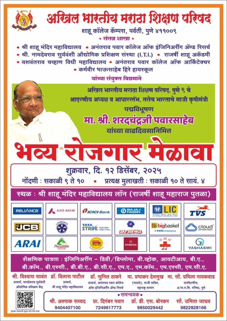 अखिल भारतीय मराठा शिक्षण परिषदेचे, अध्यक्ष व भारताचे माजी कृषी मंत्री, पद्मविभूषण डॉ. शरदचंद्र पवारसाहेब यांच्या वाढदिवसानिमित्त अखिल भारतीय मराठा शिक्षण परिषदेच्या सलग्न शाखा – राजर्षी शाहू अकॅडमी, श्री. शाहू मंदिर महाविद्यालय, यशवंतराव चव्हाण विधी महाविद्यालय, अनंतराव पवार कॉलेज ऑफ इंजिनिअरिंग अँण्ड रिसर्च, अनंतराव पवार कॉलेज ऑफ आर्किटेक्चर व श्री. नामदेवराव सूर्यवंशी औद्योगिक प्रशिक्षण संस्था, कर्मवीर भाऊसाहेब हिरे हायस्कूल, पुणे यांच्या संयुक्त विद्यमाने शुक्रवार, दिनांक १२ डिसेंबर , २०२५ रोजी विविध शैक्षणिक अर्हताप्राप्त विद्यार्थांकरिता रोजगार मेळावा आयोजित करण्यात आला आहे.